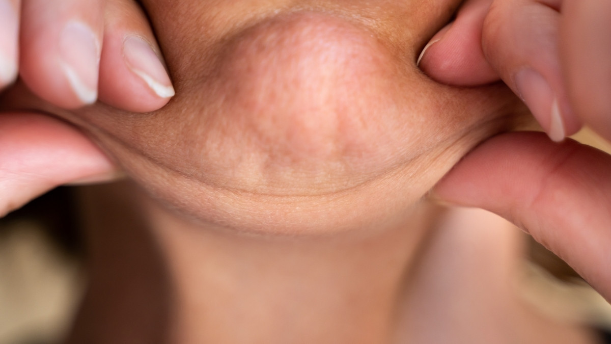 Now pull your chin straight back. Not down toward your chest. Not up toward the ceiling. Straight back, like someone's pushing the back of your head.
