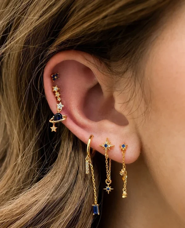Blue gemstone accents complement the warm gold tones beautifully. Each piece works together to form an elegant constellation across the ear, making this style particularly appealing for those who love astronomical themes and layered jewelry combinations.