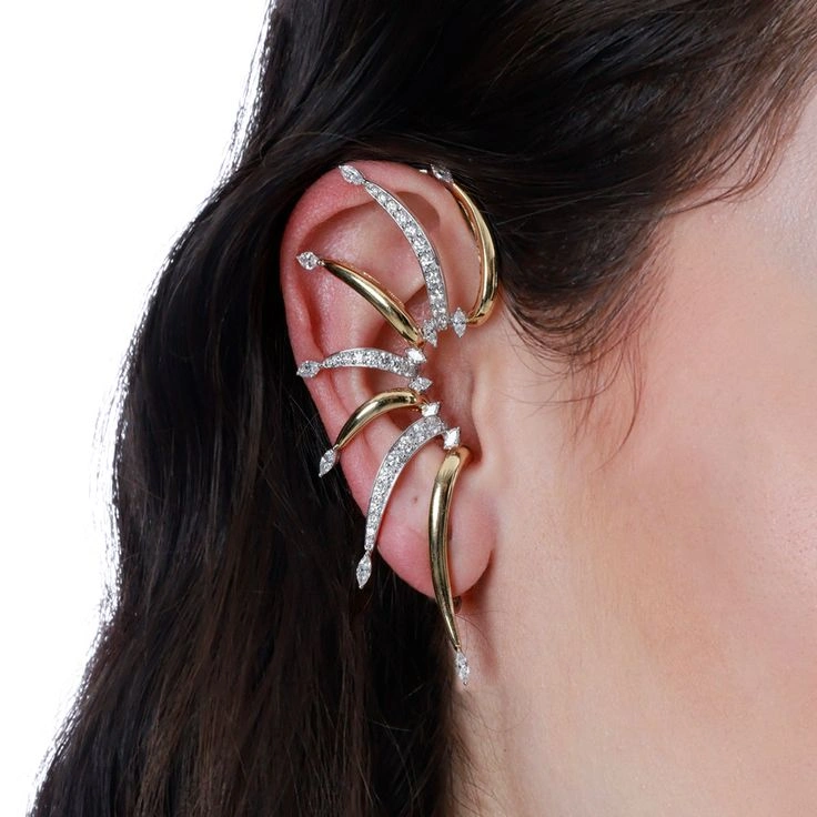 Gold settings hold the clear gems securely while maintaining an organic, flowing design. The piece transforms a single piercing into an elaborate display of glamour. Such dramatic jewelry adds instant sophistication to any outfit or special occasion look.