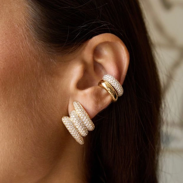 Gold bands adorned with sparkling pave diamonds create this luxurious ear stack. Multiple rings sit elegantly on the cartilage while a statement piece graces the earlobe. Each band features tiny crystals that shimmer with every movement.
