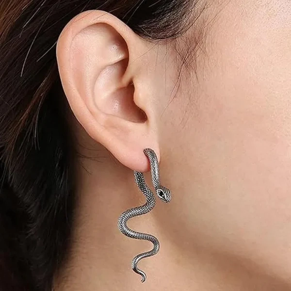 This bold snake-shaped earring creates a dramatic focal point with its curving silhouette. The detailed metalwork features intricate scales and a realistic serpent head that appears to slither along the earlobe, making an edgy fashion statement.