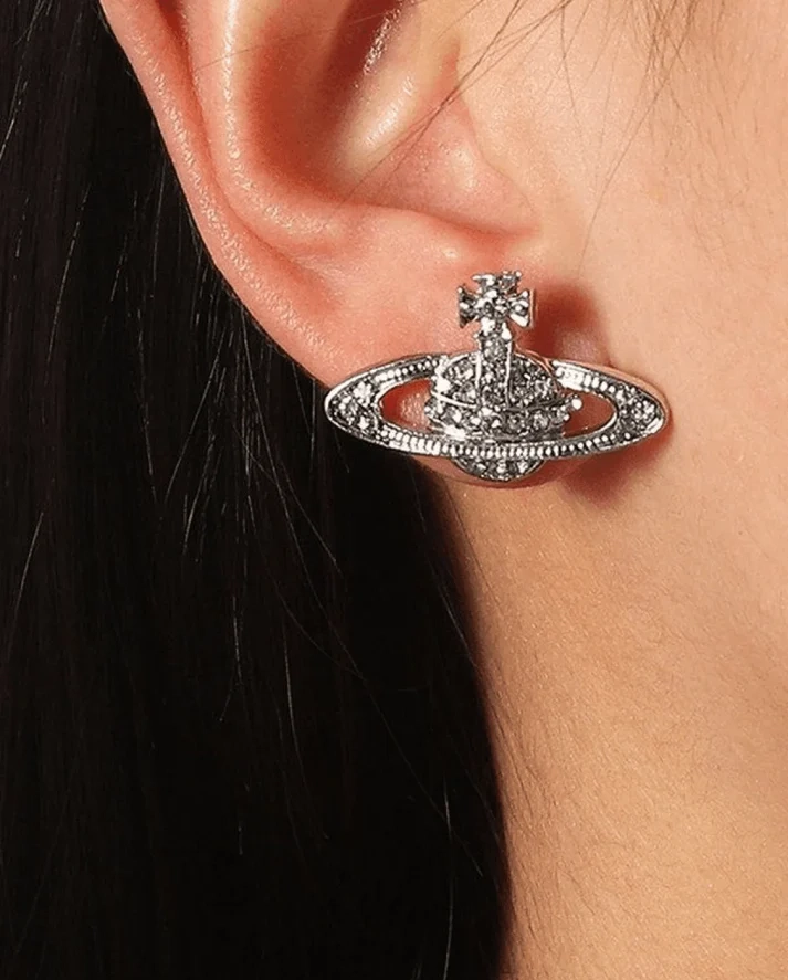 This extravagant silver earring features an iconic orb design encrusted with sparkling crystals. The oversized piece transforms a simple lobe piercing into a glamorous focal point, showcasing intricate detailing and premium craftsmanship that commands attention.