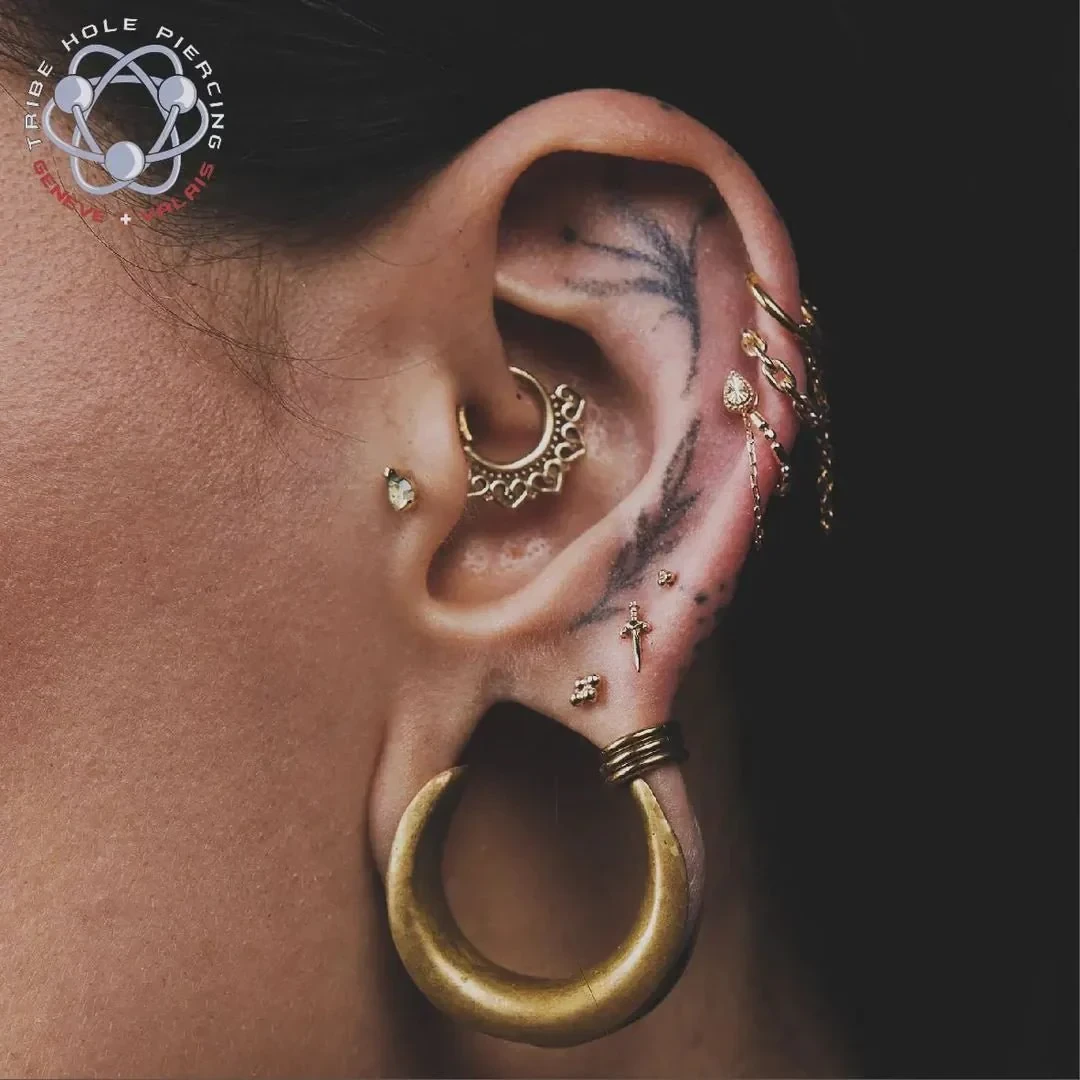 This elaborate ear curation showcases multiple piercing placements with varied jewelry styles. Gold and silver pieces create visual contrast, featuring ornate daith jewelry, delicate studs, chains, and a bold stretched lobe with tunnel jewelry that anchors the entire composition.