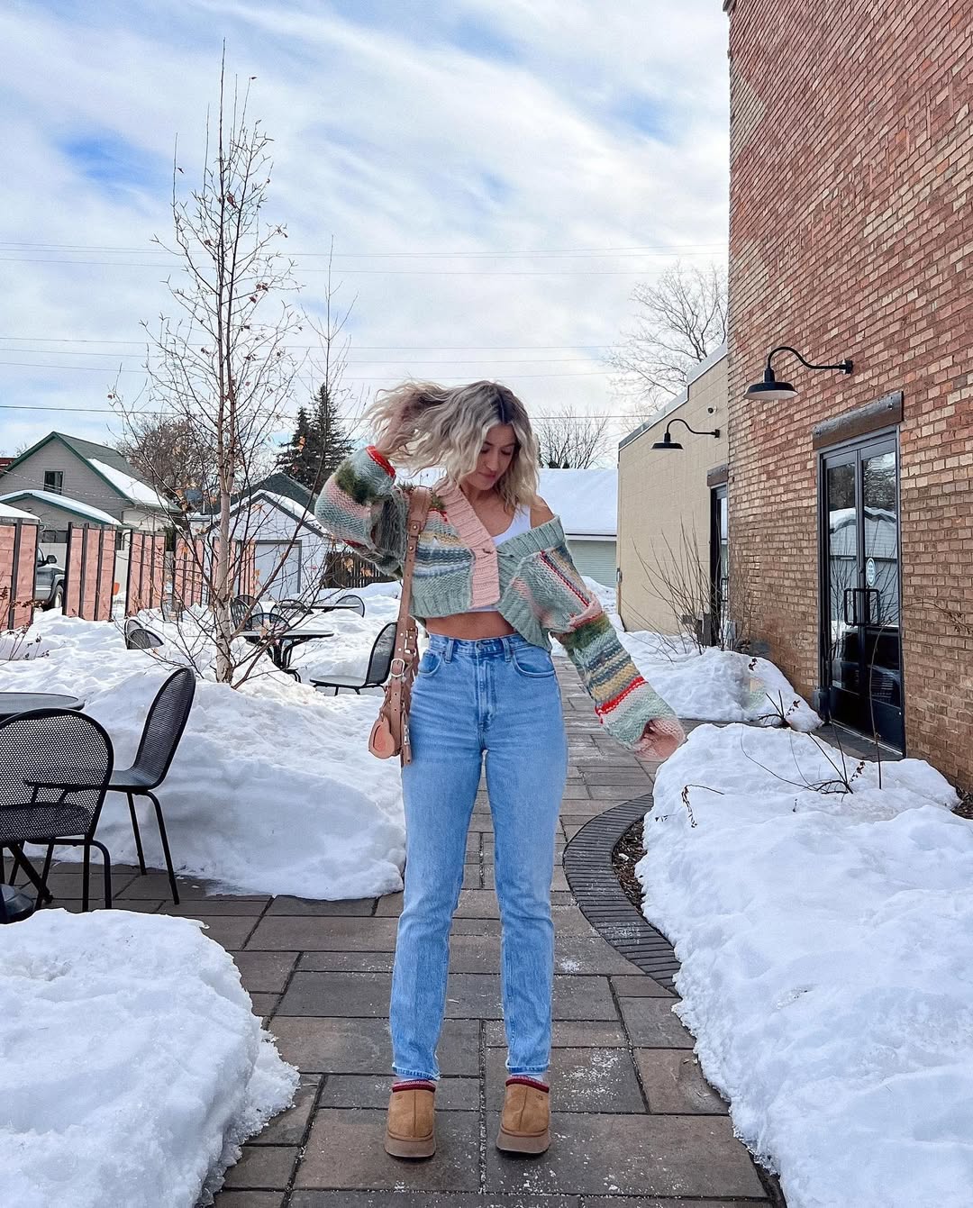 Light wash high waisted jeans and tan shearling boots bring cozy warmth. Burgundy socks add a playful pop while a blush crossbody completes this winter prairie aesthetic that honors handmade heritage through textured knitwear.