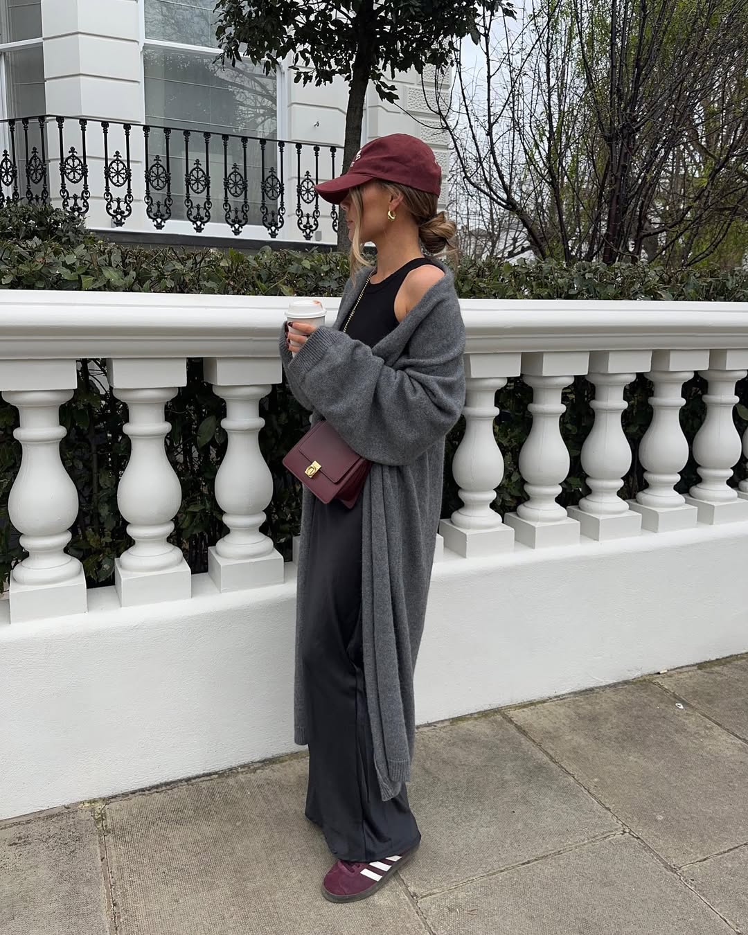 A burgundy baseball cap and matching sneakers bring sporty modern edge. The oxblood crossbody bag completes this contemporary prairie aesthetic that adapts homestead simplicity for urban coffee runs.