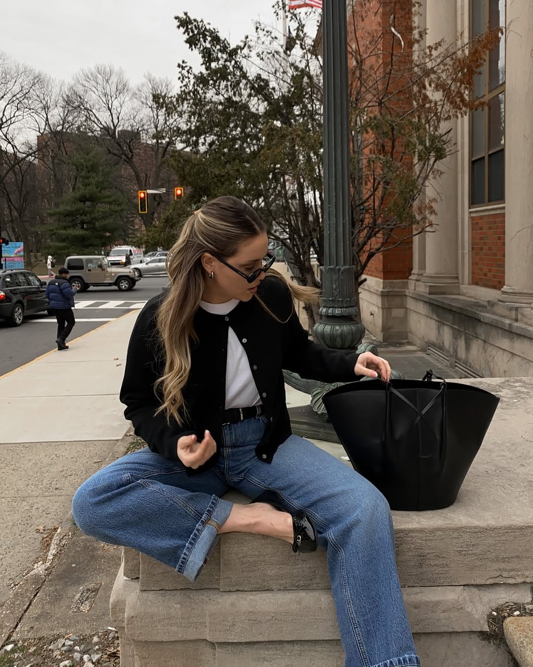 A black varsity style jacket layers over a crisp white collared shirt for this modern prairie meets preppy look. Mid wash straight leg jeans create timeless appeal with modest coverage.
