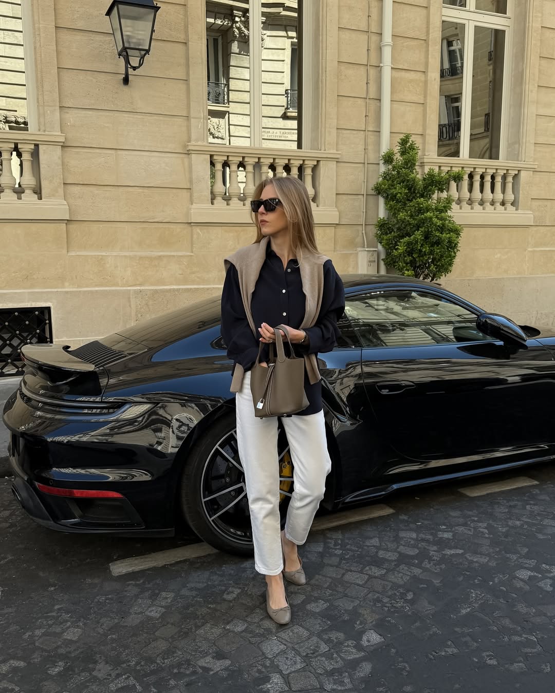 Two tone ballet flats in beige and black add Parisian polish. A sleek black bag completes this refined prairie aesthetic that balances homespun comfort with modern cafe sophistication.