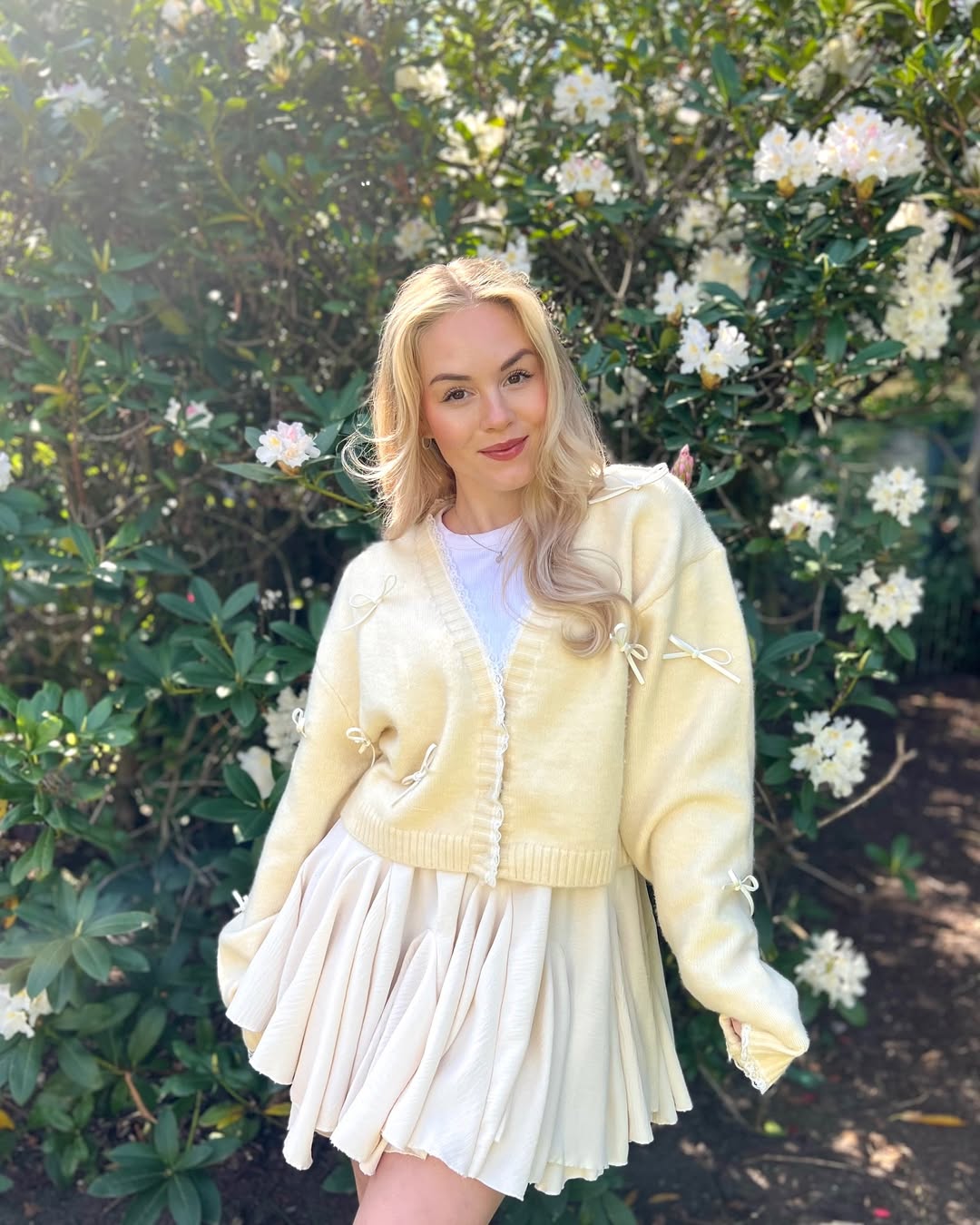 A soft butter yellow cardigan adorned with delicate ribbon bows creates sweet prairie charm layered over a crisp white top. The pleated white tennis skirt adds youthful femininity with flowing movement.
