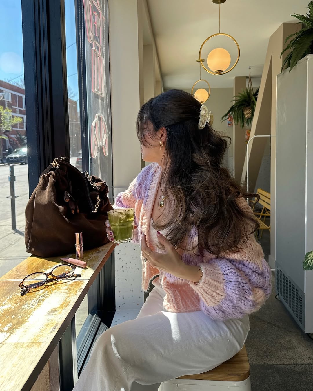 A cream hair claw clip and cognac hobo bag complete the look. This soft pastel combination captures modern prairie wife aesthetic through gentle colors and tactile knitwear for cafe moments.