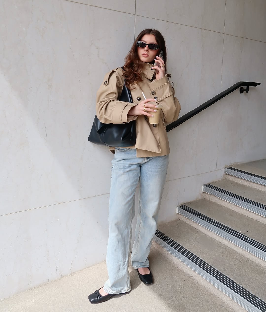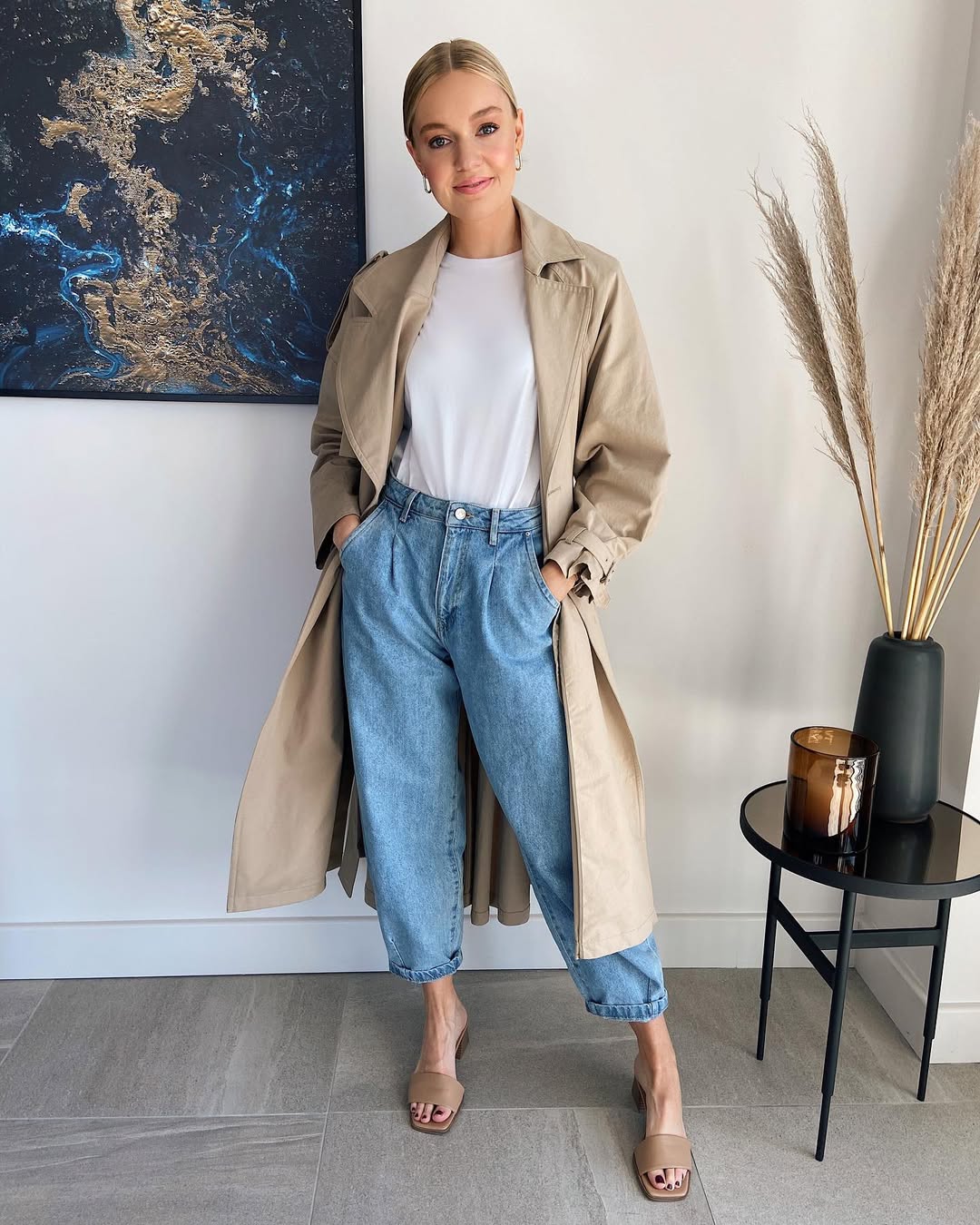 9. Khaki Trench Jacket with Light Wash Wide Leg Jeans