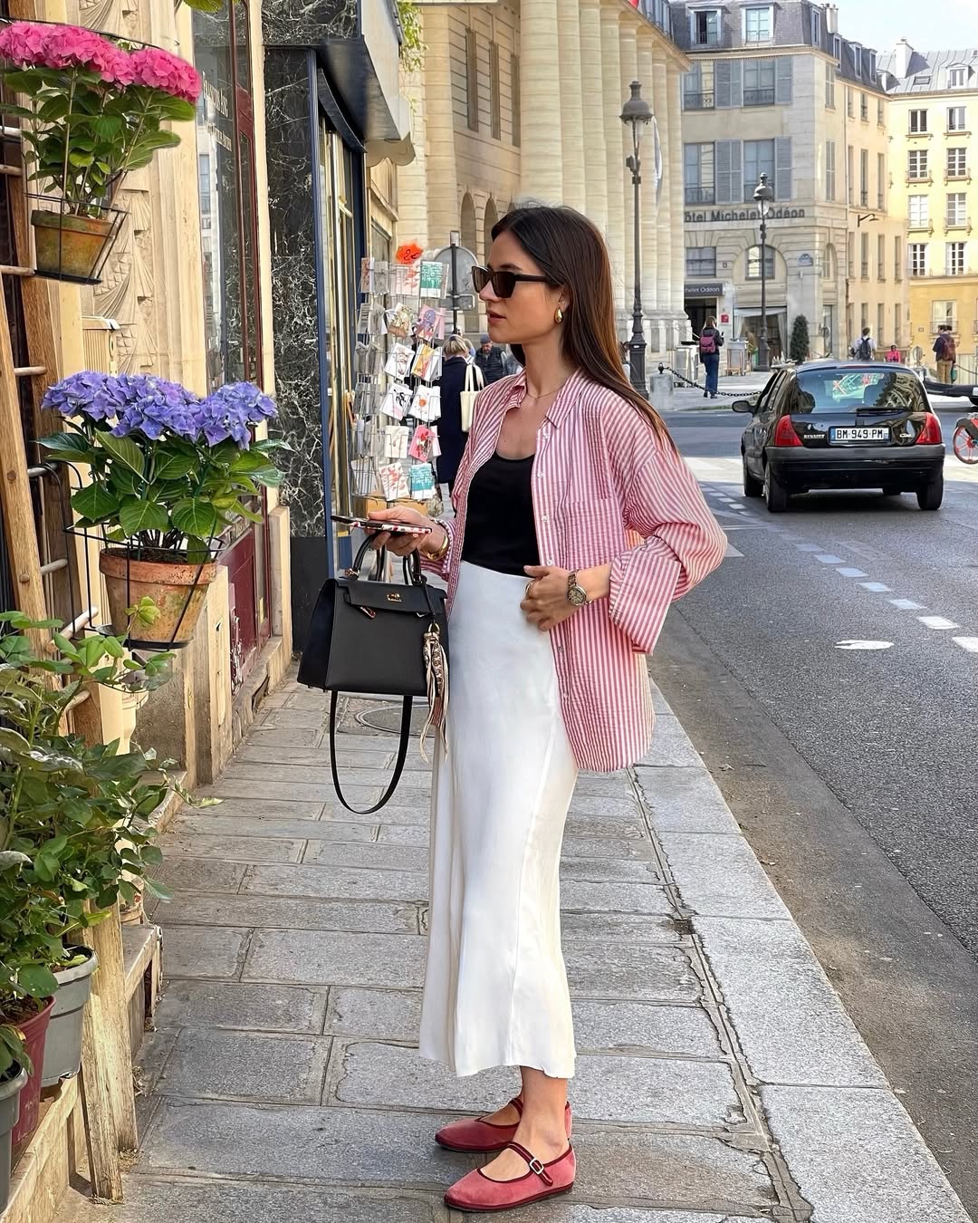 Coral pink Mary Jane flats add vintage sweetness while a black structured bag keeps the look polished. This relaxed prairie aesthetic blends timeless stripes with modern Parisian ease.