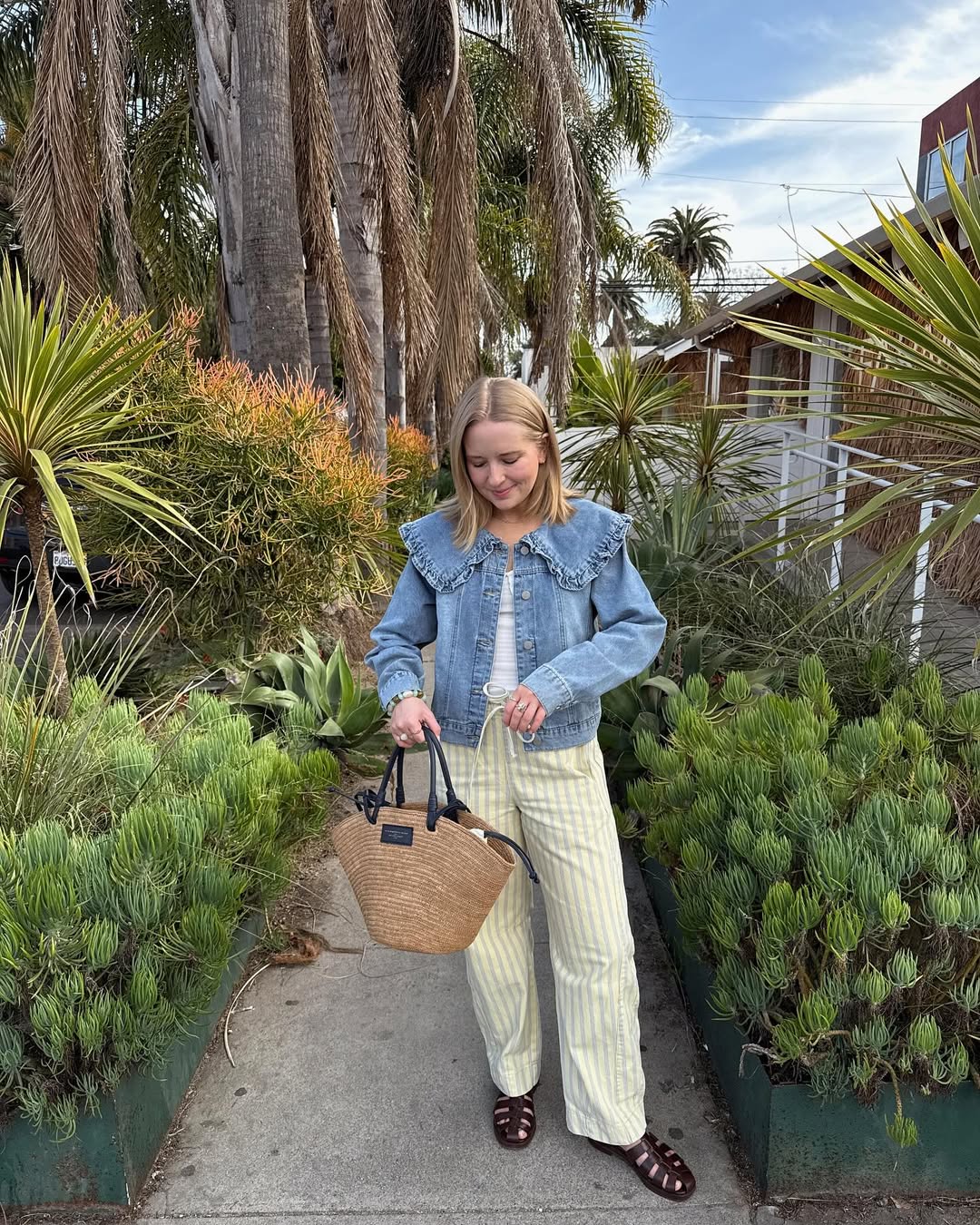 21. Ruffled Collar Denim Jacket with Yellow Striped Linen Pants