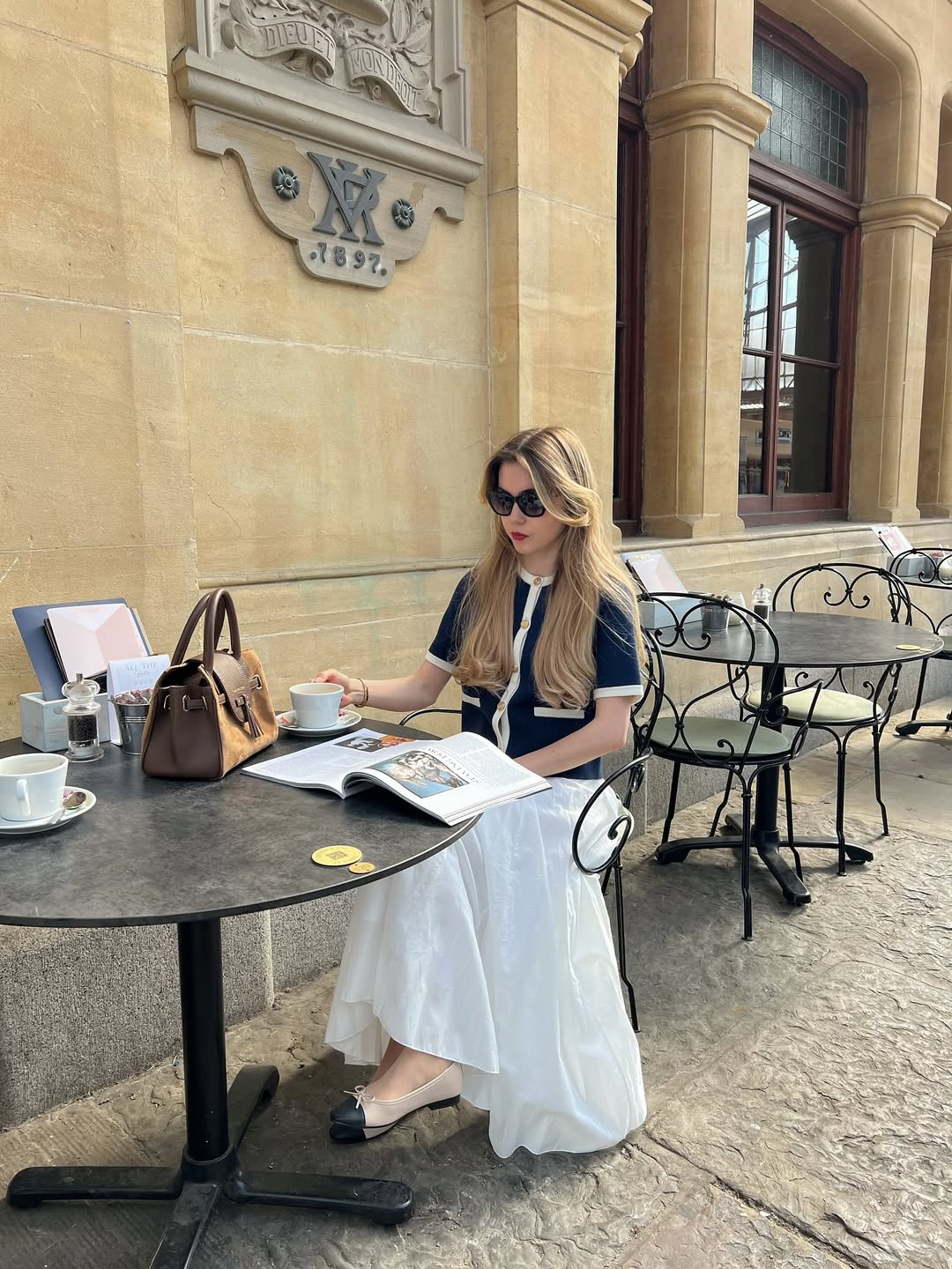 Two tone ballet flats in beige and black add chic contrast while a structured taupe bag completes the look. This refined prairie aesthetic balances covered modesty with polished city style for reading and coffee moments outdoors.
