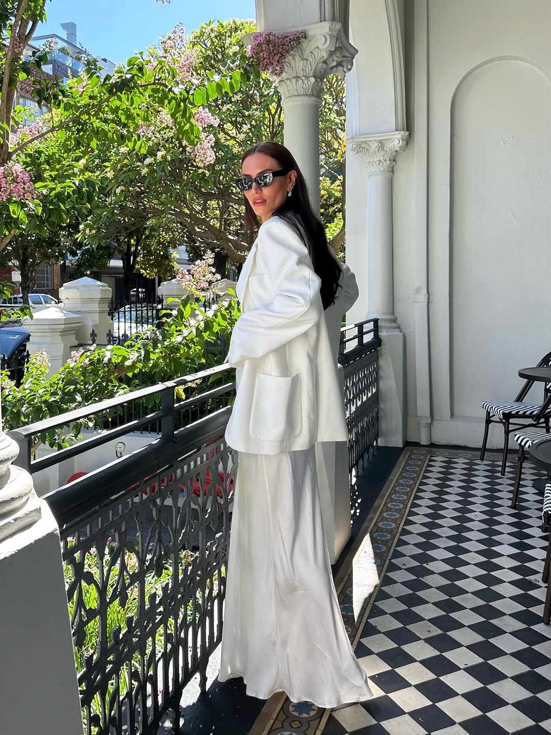 30. Cream Longline Blazer with White Flowing Maxi Skirt