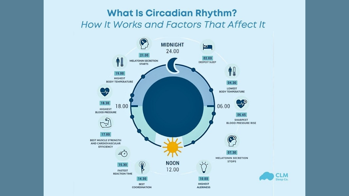 24-hour internal clock controls metabolism, digestion, and hormone release. Synced by light and food timing.
