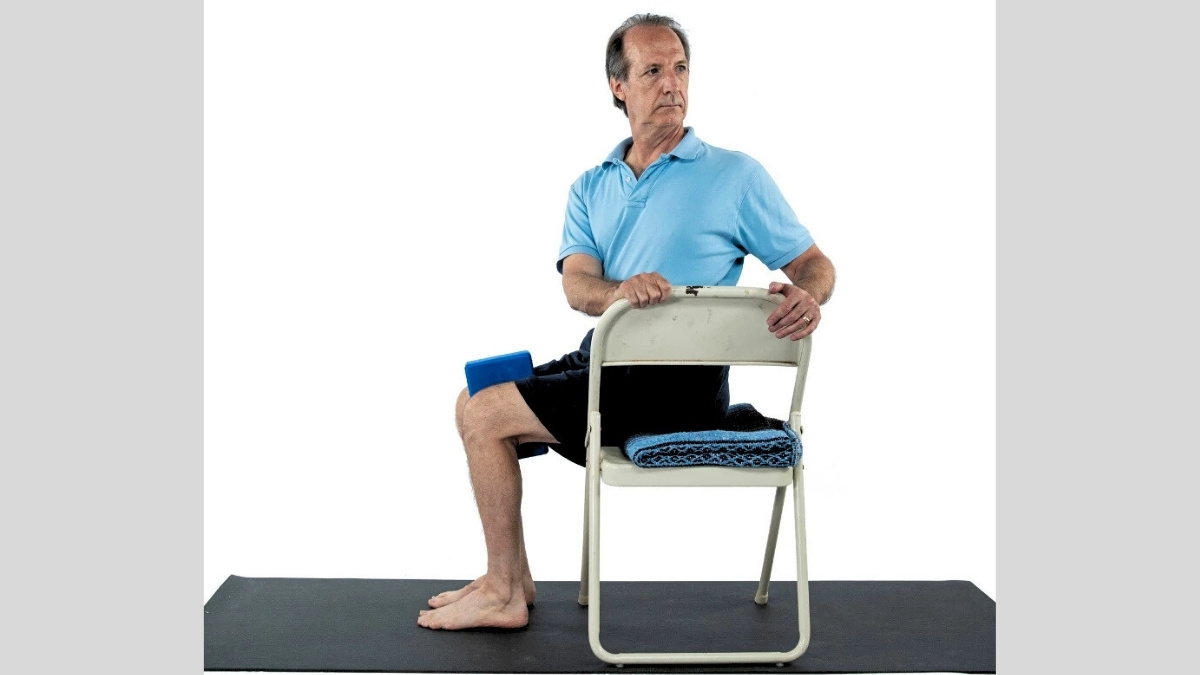 Step 2: Place Your Hands Put your left hand on your right knee. Place your right hand on the back of your chair or armrest.