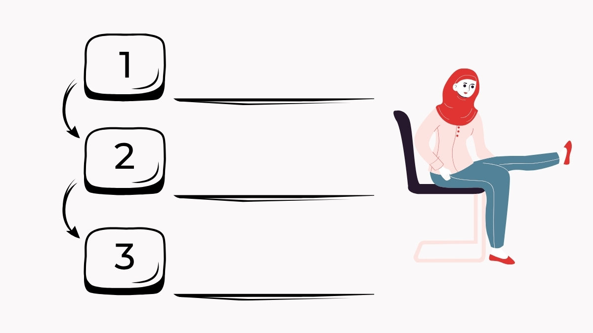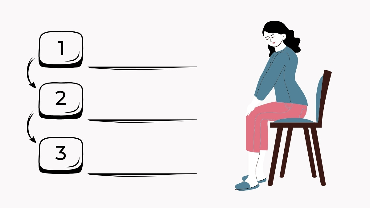 Step 1: Get Ready Sit in your chair with your feet flat on the floor. Keep your back straight but not stiff. Rest your hands on your thighs.